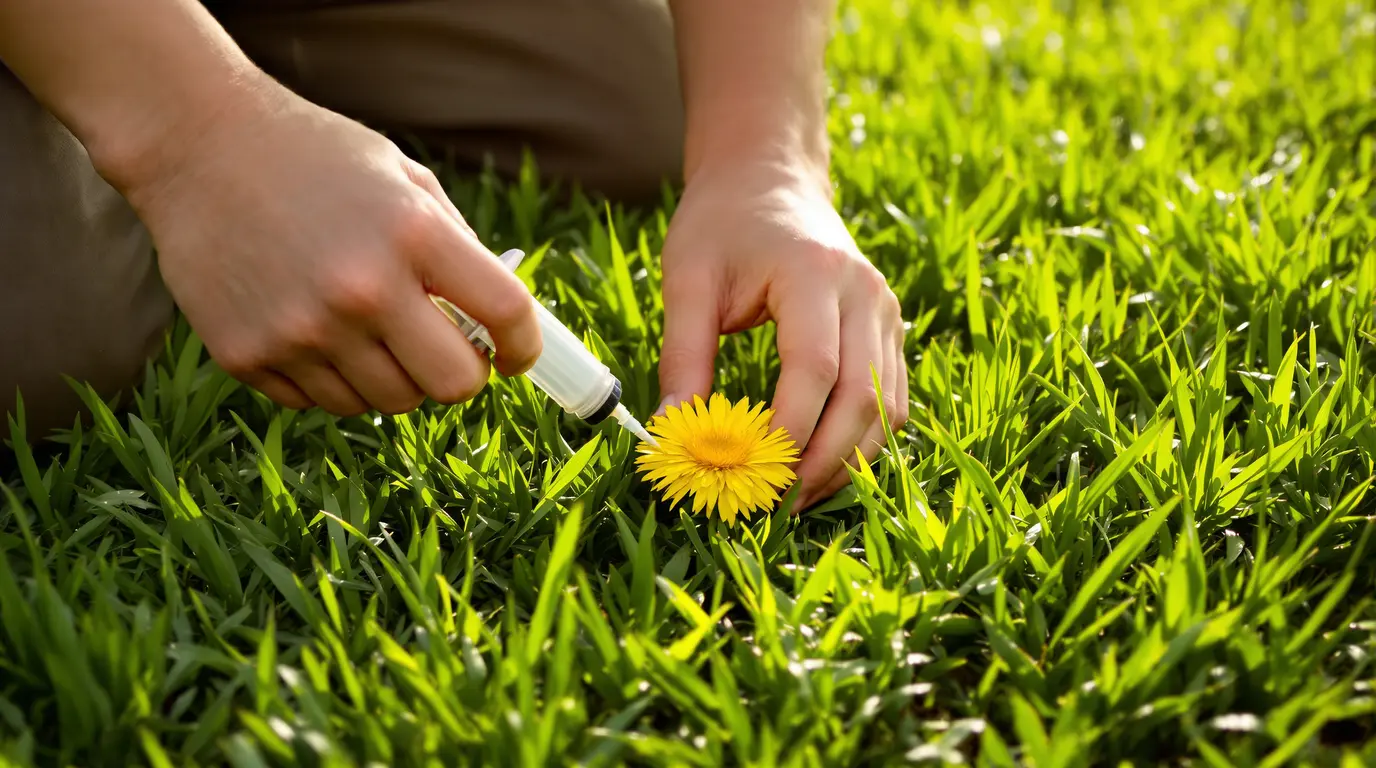 Concrètement, il s’agit d’utiliser une petite seringue pour déposer un produit au centre de la rosette, juste à la base des feuilles. Ainsi, le pissenlit absorbe le traitement par l’intérieur. L’herbe autour reste beaucoup mieux protégée.
